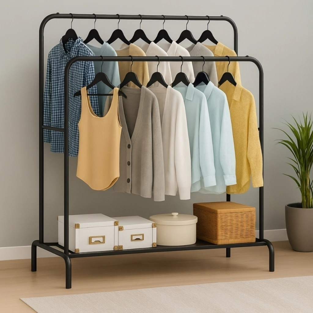 Es una solución práctica y resistente para organizar tu ropa de manera eficiente. Con su diseño funcional te ofrece espacio para colgar prendas, sombreros y almacenar zapatos, maximizando el uso del espacio y manteniendo tus objetos al alcance de la mano.